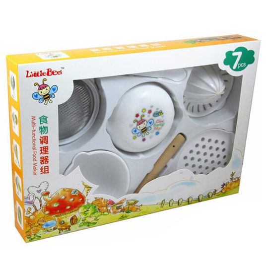 • Baby food maker set ideal for babies 4 months onwards. Makes weaning and solid food feeding easy and convenient! – With 7pcs. Feeding items which include plate, juicer,spoon,pestle,strainer, cup & grater
